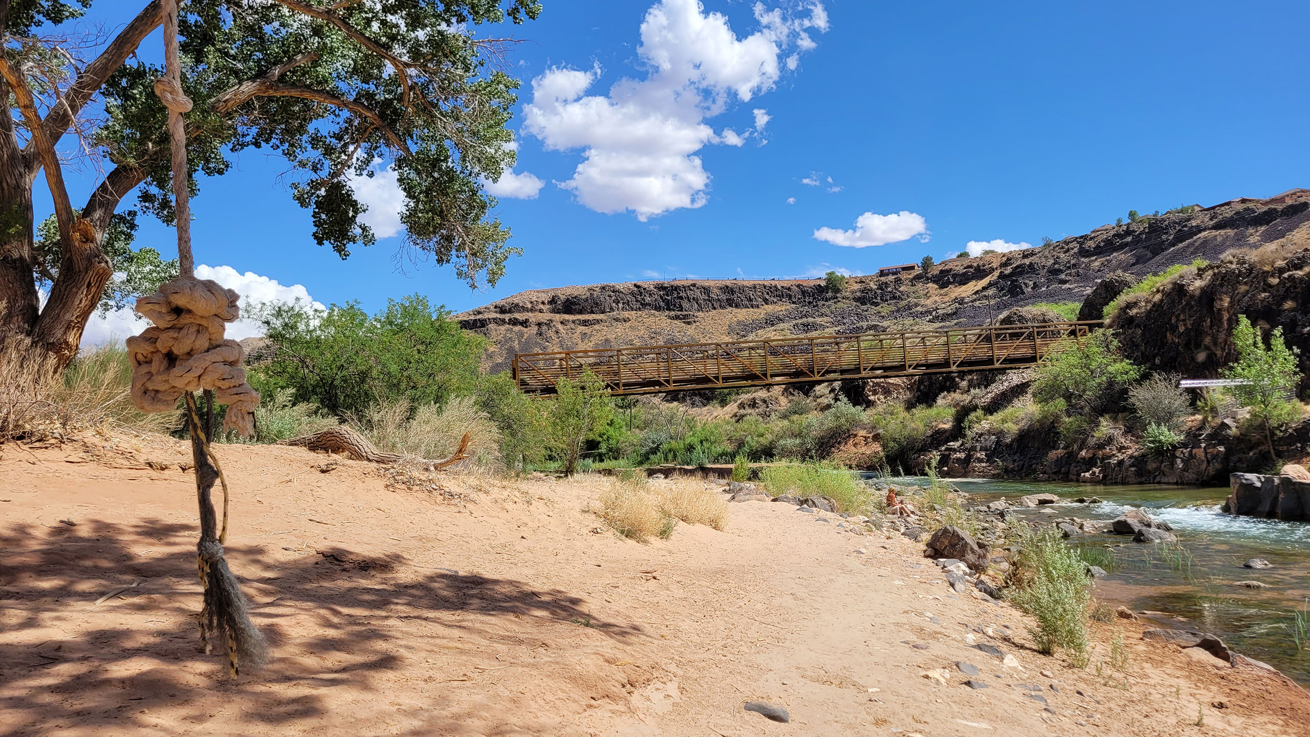 From Main Street in Hurricane, travel north until the road ends at the clifftops. A vault toilet and signs mark the trailhead, with a stepover and a small footpath leading to the river below.